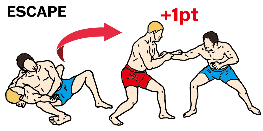 エスケープポイントはポジションを奪われた状態(サイド、マウント、バック)から脱出し、スタンドに向き合った状態に回復した場合のみポイントとなります。
