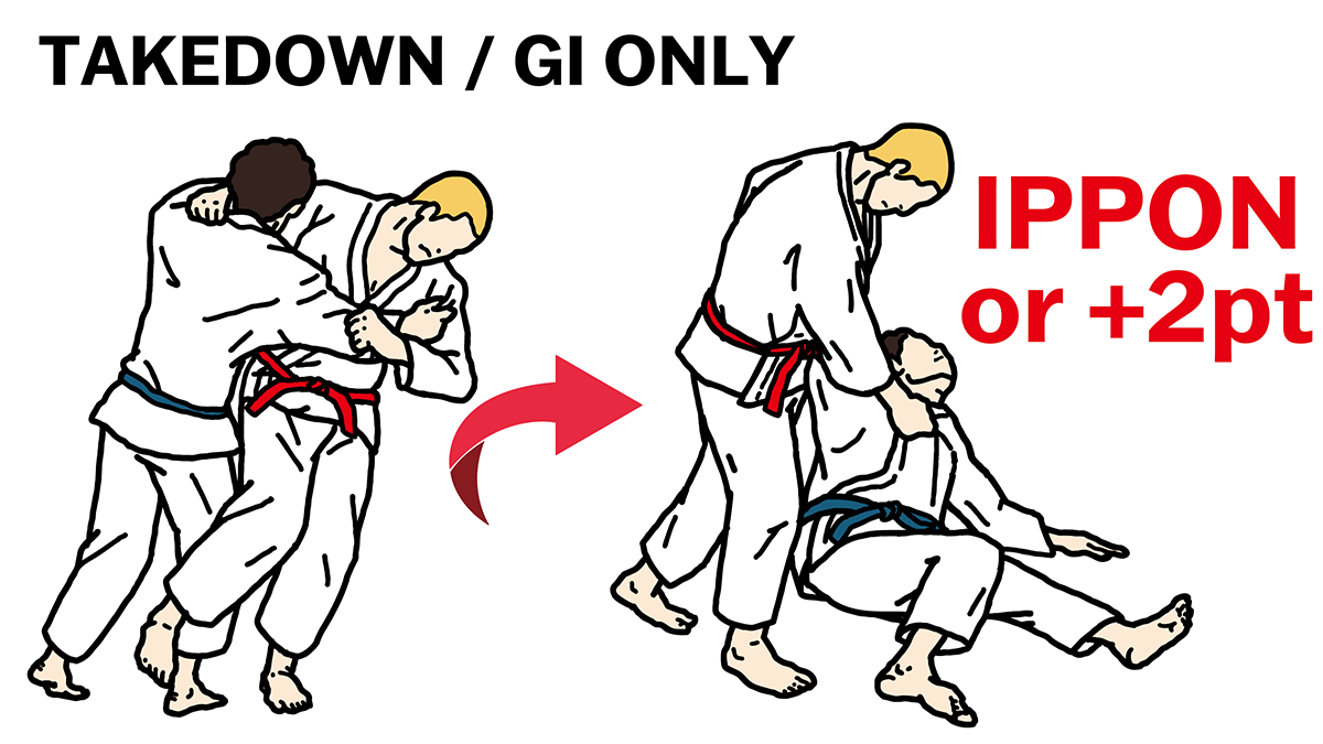 『2秒』としています。サブミッションを仕掛けられていた場合は、そのサブミッションを解除した時点でポイントになります。テイクダウンの一本は道着ルールのみとなります。